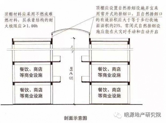 5.步行街兩側(cè)建筑的商鋪,其面向步行街一側(cè)的圍護(hù)構(gòu)件的耐火極限不應(yīng)低于1小時(shí)。相鄰商鋪之間面向步行街一側(cè)應(yīng)設(shè)置寬度不小于1米、耐火極限不低于1小時(shí)的實(shí)體墻;當(dāng)步行街兩側(cè)的建筑為多個(gè)樓層時(shí),每層面向步行街一側(cè)的商鋪均應(yīng)設(shè)置防止火災(zāi)豎向蔓延的措施;