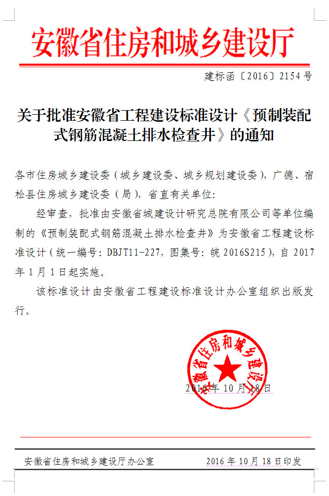 關(guān)于批準安徽省工程建設(shè)標準設(shè)計《埋地排水用內(nèi)肋增強聚乙烯(PE)螺旋波紋管管道工程選用及安裝圖集》的通知